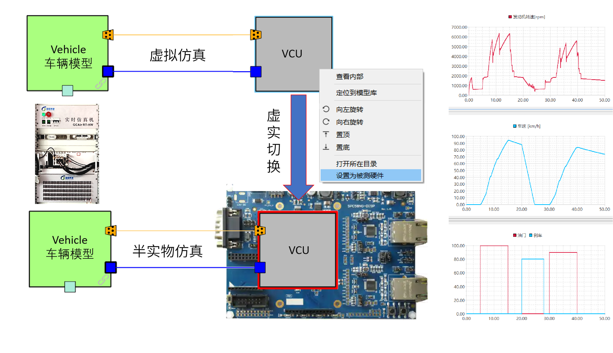 本案例实现新能源整车控制器VCU的硬件在环仿真测试和验证。搭建GCAir工程:1.车辆子系统做为被控对象、其FMU由GCKontrol生成;2.VCU子系统做为控制器,其嵌入式系统C代码由GCKontrol的VCU模块生成;3.配置总线报文及收发矩阵,建立被控对象与VCU的通信; 4.一键虚实切换,完成VCU硬件在环(HiL)仿真测试和验证。用TestManager自动化测试工具,完成多种工况的批量自动化测试,并生成测试报告。本案例实现了控制算法的全方位评估、对控制器的可靠性全面验证。